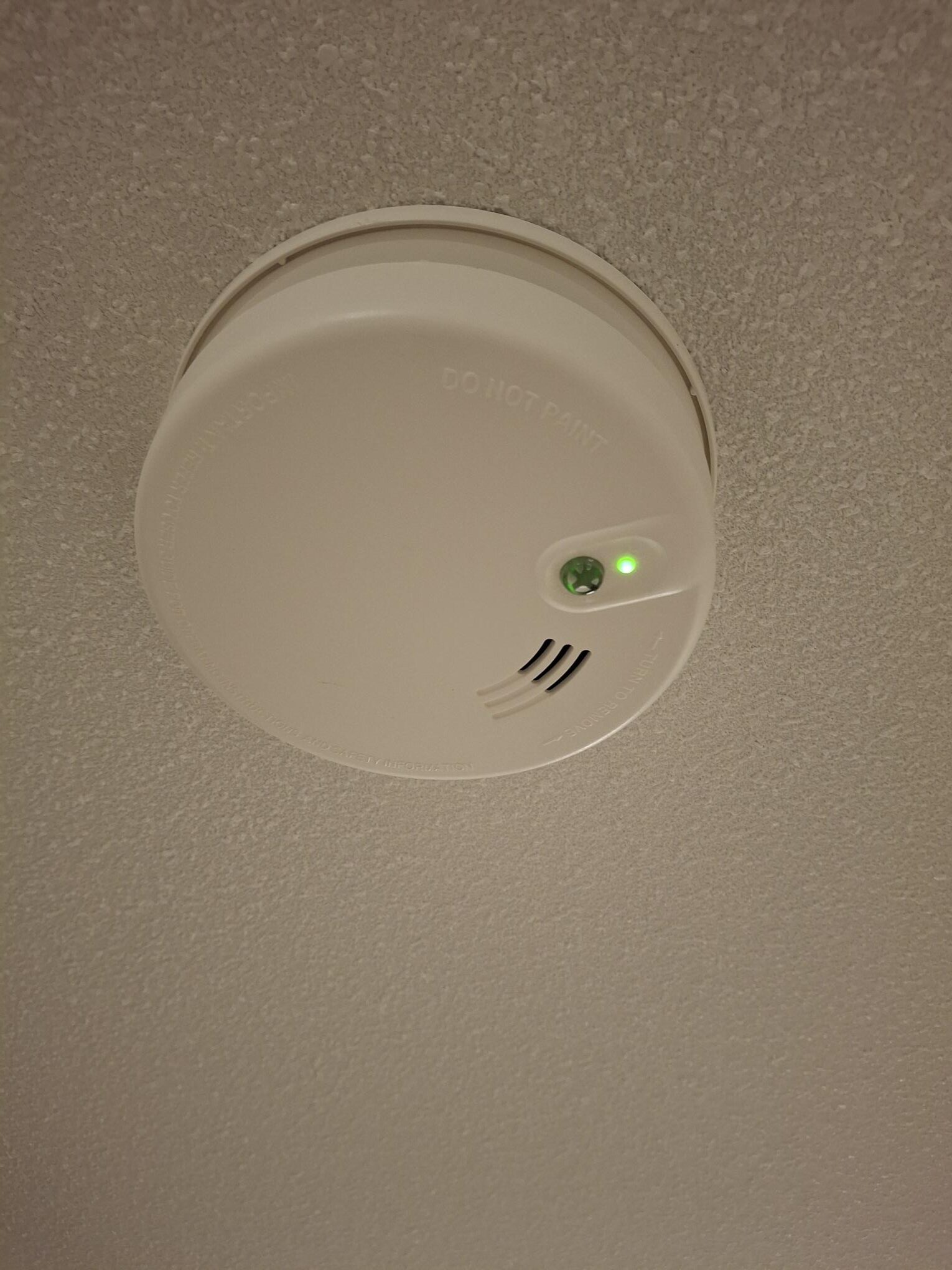 ![]() | Hier ziet u de rookmelder gemonteerd tegen het plafond. Er moet altijd een groen lampje branden. |